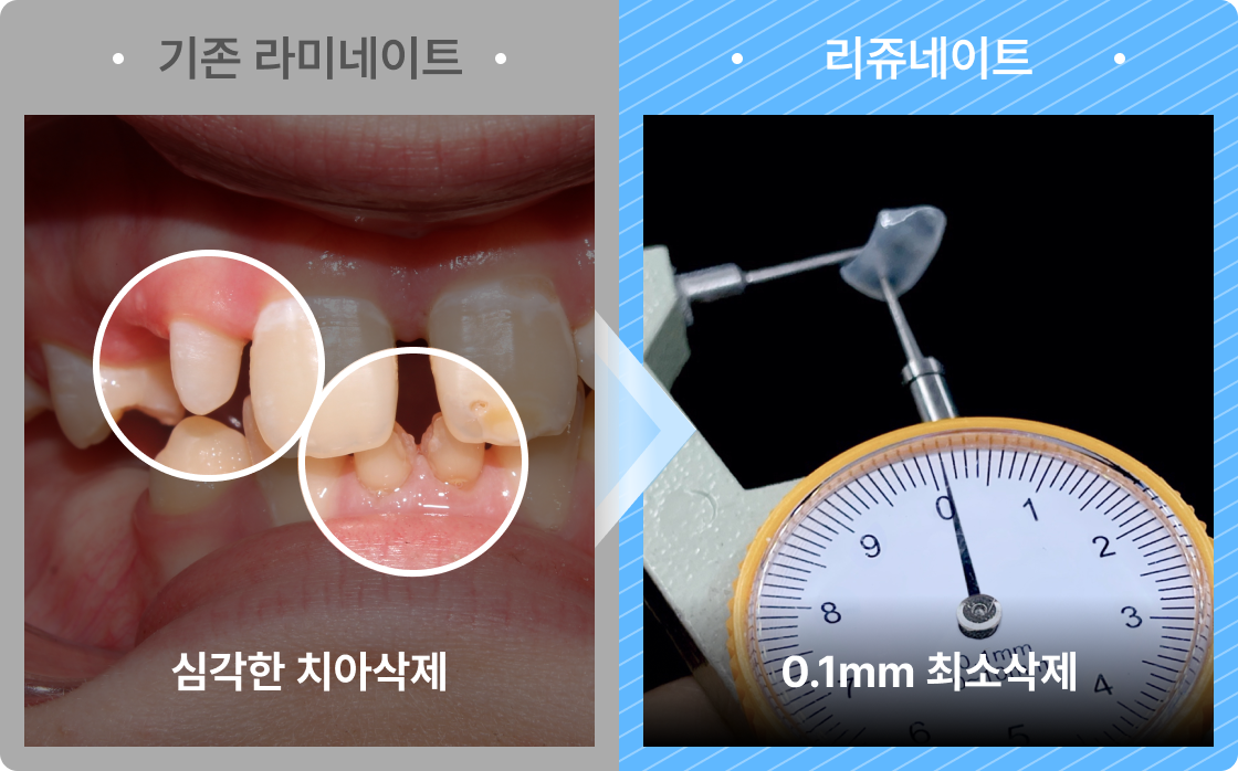 다인치과의 리쥬네이트는 0.01mm의 최소한의 치아 삭제만으로 시술이 가능하며,